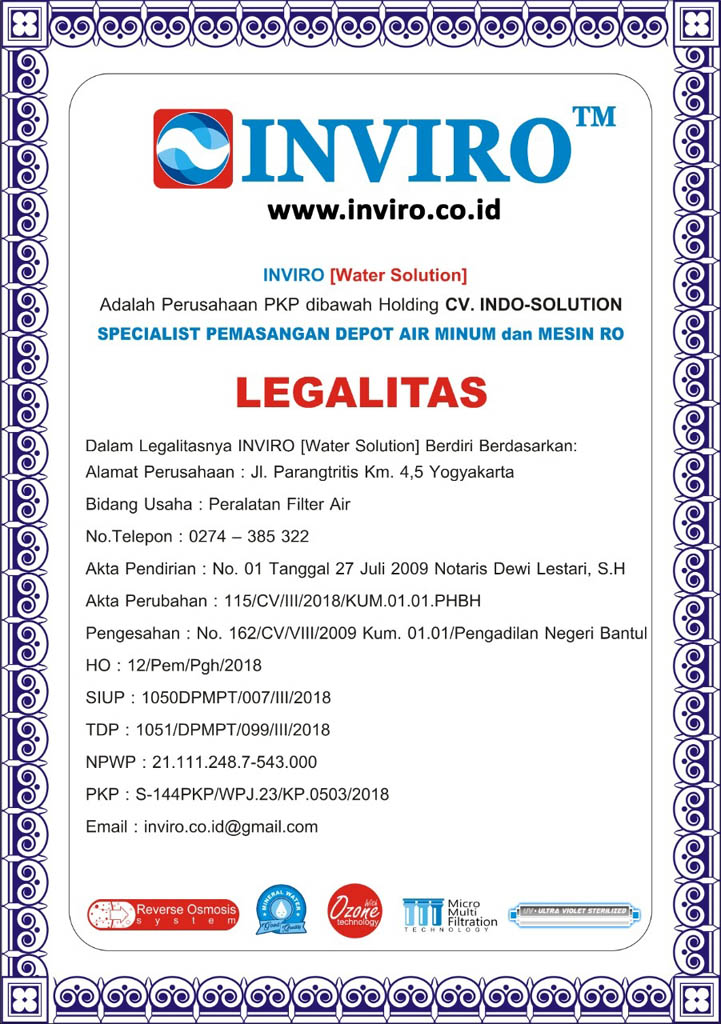 Divisi water treatment/water purifier CV. INDO SOLUTION yang bernama INVIRO™ [Water Solution] menghadirkan layanan komprehensif dalam bidang pengolahan air. Didukung dengan tenaga yang professional, pengalaman dan jam terbang yang tinggi dalam bidang pengolahan air.